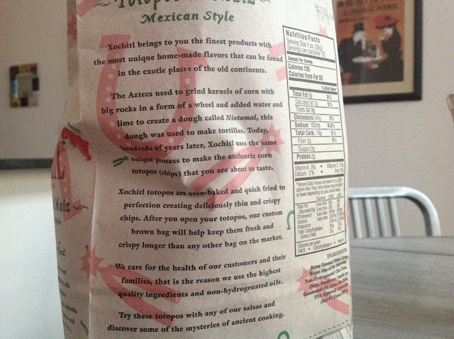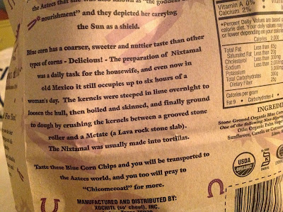 The Xochitl company makes orange and black chips for Halloween, red and green for Christmas, and red and white for Valentine's Day. One day in October, I noticed the following on the back of the Halloween bag:
